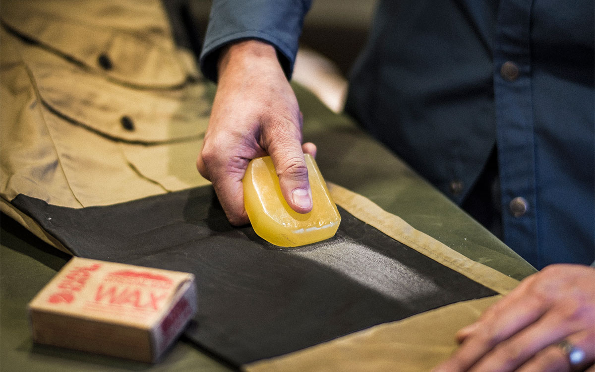 Breng een dunne, gladde laag wax aan door de blok Greenland Wax met lange, gelijkmatige bewegingen over de stof te wrijven. Zet gerust een beetje druk indien nodig, maar zorg dat het resultaat niet slordig wordt.