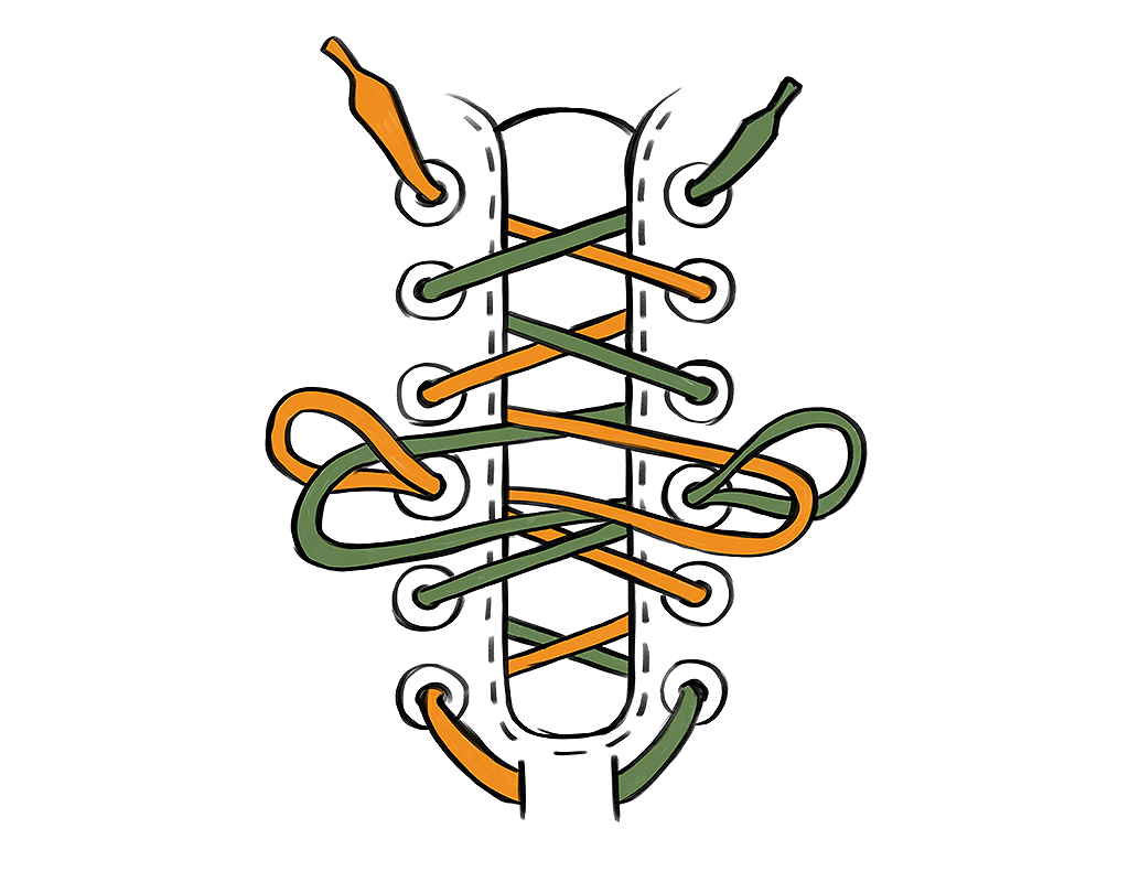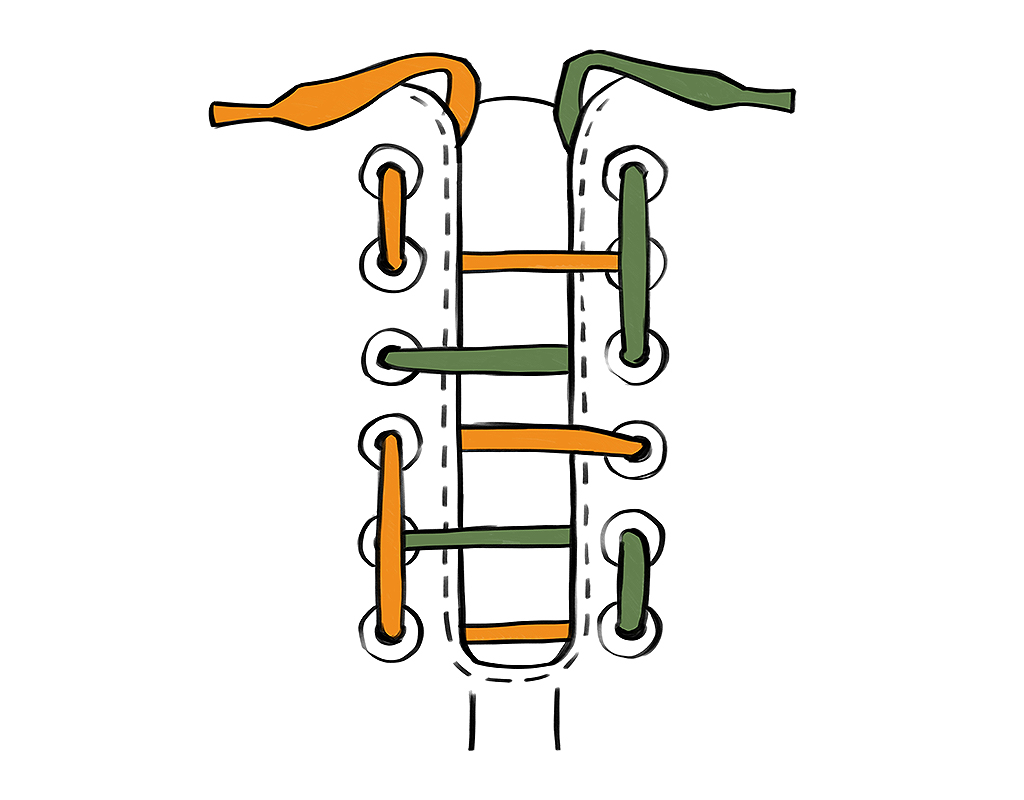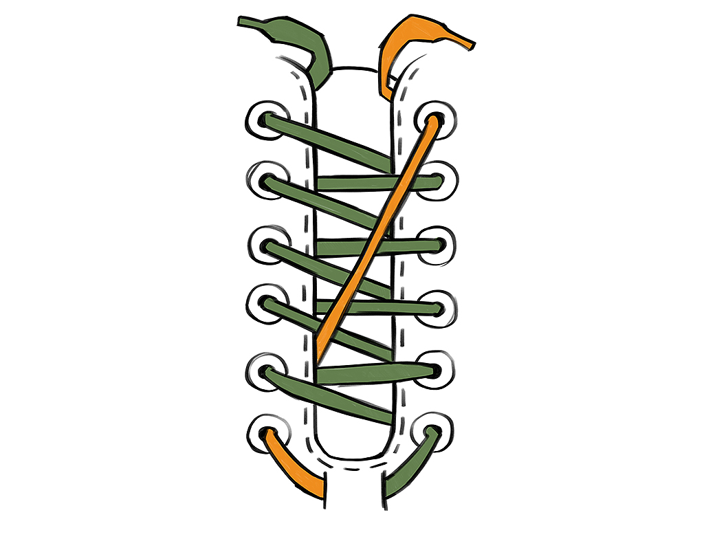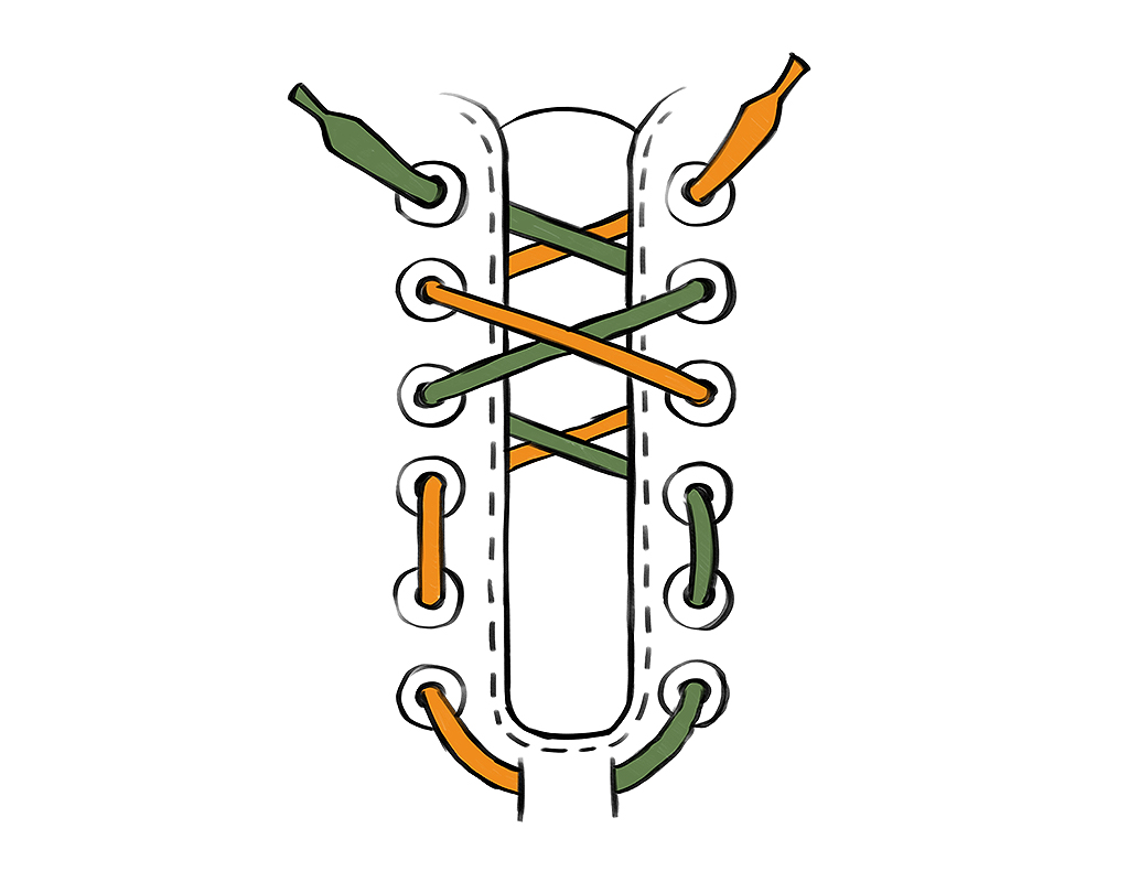 Voelen je schoenen te smal aan bij je tenen? Of kleuren je teennagels donkerder (of zelfs zwart)? Rijg dan de ene helft van de veter diagonaal van teen naar top en de andere helft kruisend tot boven. Zo wordt de neus van je schoen lichtjes opgeheven en krijgen je tenen meer ruimte.